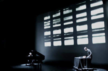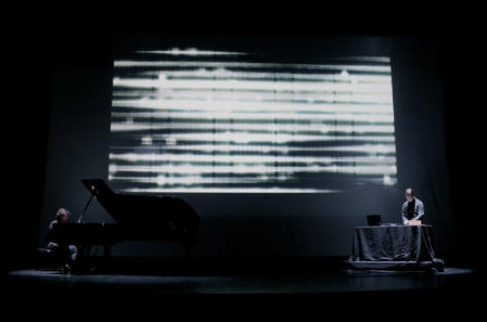 sound and video. The sound of THEMA is based on two fondamental components, the acoustic represented by the piano and the electronic focused on the research