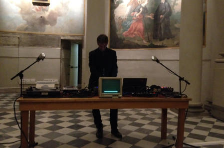 Several " electrosmog detectors" placed in the venue, are intergrated in his composition and permit in this way a realtime monitoring of the electromagnetic stream, coming from the
